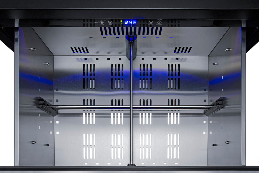 Summit is expanding its popular lineup of built-in undercounter refrigeration with new luxury choices for 27'' wide spaces in residential or commercial kitchen indoor and outdoor spaces. Model SPR275OS2DADA is a 27'' wide 2-drawer all-refrigerator sized just under 32'' high for an easy fit under lower ADA compliant counters. It comes in a shallow depth just under 24'' for added space savings. Stainless steel drawer construction ensures lasting durability and a stunning look to suit any setting, with a set of pro style handles included. The fully finished drawer fronts can also accept overlay panels for a custom look to blend into your own cabinetry. The front-breathing design allows built-in installation, while the fully finished black cabinet also enables freestanding use. The sealed back and right angle plug help to ensure an easy fit. With nearly 5 cu.ft. of interior capacity, the SPR275OS2DADA is perfect for keeping a variety of items in easy reach. Each drawer includes a removable divider that lets you create four adjustable sections inside to help organize the interior. The intuitive digital control panel features a wide range from 34 to 65ºF, allowing you to adjust your storage conditions for standard food items or beverages better held at warmer temperature. The temperature display can be switched from Fahrenheit to Celsius for added convenience. Both drawers feature LED lighting in a striking blue finish for elegant illumination. Frost-free operation minimizes maintenance and internal fans help to maintain an evenly cooled interior. Additional features include open drawer alarms, a child lock to prevent changes to the controls, an eco mode setting, and a 96 hour sabbath mode to disable certain features for periods of observance. The SPR275OS2DADA features weatherproof construction for safe installation in outdoor kitchens. It is ETL-S listed to NSF-7 commercial standards and also complies with residential regulations for home use. In addition to this refrigerator, we also manufacture the same style in a 30'' fit. Browse Summit's extensive selection of built-in undercounter refrigeration to discover the perfect fit for virtually any kitchen space.