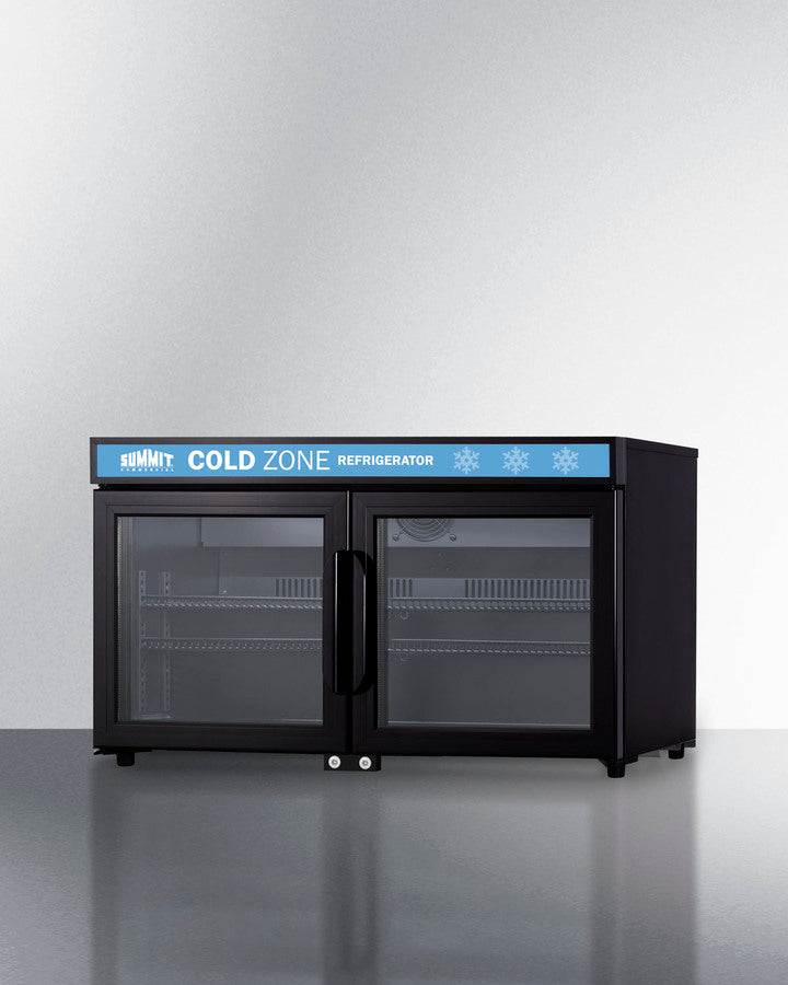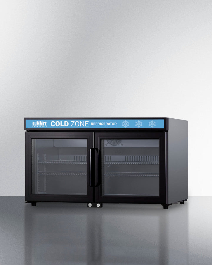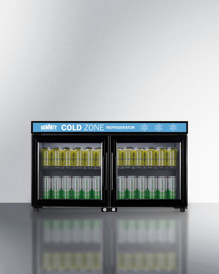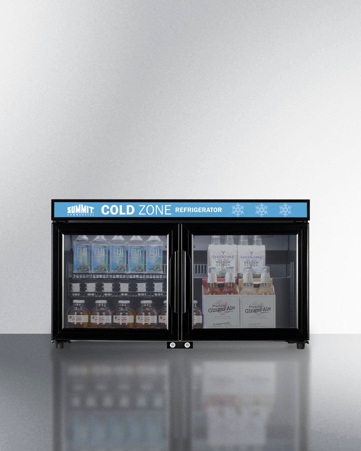 Summit Commercial refrigerators are designed for convenient use in an attractive presentation to increase impulse purchases. The SCR3502DLL is a 17.5'' shallow depth single-zone beverage refrigerator with a 36'' width, making it ideal for countertops and use on or in shelves (with proper ventilation). It is SGS-listed to NSF-7 standards for use in commercial settings and is designed for freestanding use. Its French door swing with two glass doors offers a full view inside the 3.2 cu.ft. interior, while pre-installed curved, sturdy black handles make for easy opening of the unit. Both doors have a self-closing feature to help protect stored items in commercial settings where customers may not take the time to ensure a tight seal. Factory-installed locks offer additional security. The fully-finished black cabinet suits any setting, with a sealed back for easier cleaning. Four leveling legs keep the unit level on uneven surfaces.Inside, the SCR3502DLL utilizes automatic defrost operation for minimal user maintenance. LED lighting illuminates the interior, while the front LED panel affords the ability for users to insert their own decal for a truly customizable look. Four black wire shelves accommodate a variety of storage options, including condiments, cans, and other refrigerated items. Additionally,the shelves can be removed to store bottles or larger food and beverage items. Each shelf has a front lip to ensure products are secure when the door is opened and closed. Digital controls located on the inside offer easy temperature management with a readout in Celsius. For added peace of mind, an audible high/low temperature alarm sounds if the temperature in the unit goes out of the recommended range.With its compact dimensions and customizable features, the SCR3502DLL is perfect for back bars, retail and convenience stores, supermarkets, and similar commercial environments seeking dependable refrigeration storage in a versatile design that fits in virtually any small space.