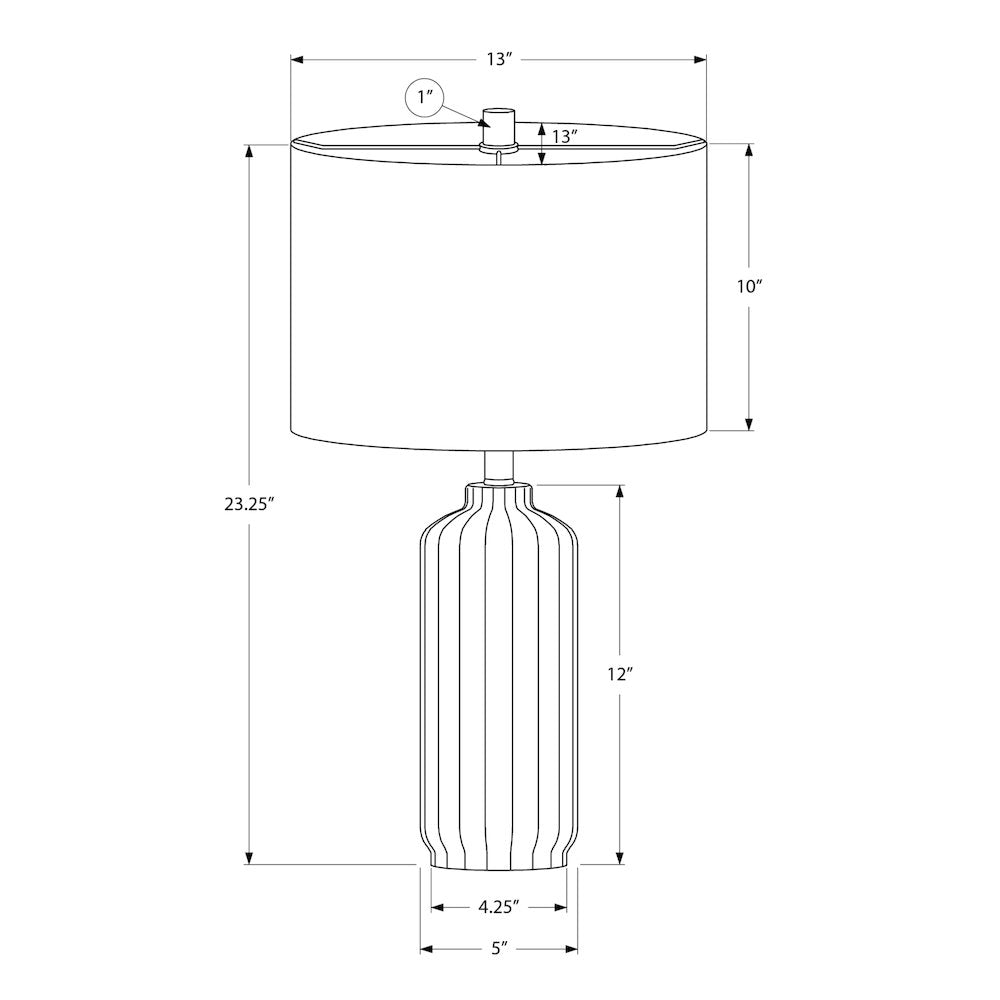 Beautify your space with this fashionable and stylish 23''h glossy blue ceramic table lamp. Composed of high-quality ceramic material in a chic ribbed design, this decorative lamp is complimented with a sophisticated ivory fabric shade that diffuses the light beautifully, generating a warm ambiance that brightens your end or side table, nightstand, or bedside table. Equipped with an easy on/off turn knob switch for effortless control, this lamp operates with a standard 100W bulb (not included) to create a welcoming atmosphere. Enjoy peace of mind with our 2 year limited warranty against manufacturer defects, ensuring a reliable and well-made lighting accent. Well suited to fit all decor styles, illuminate your living room, bedroom, or office with this versatile and on-trend table lamp with a columnar shape base, adding dimension to a room.