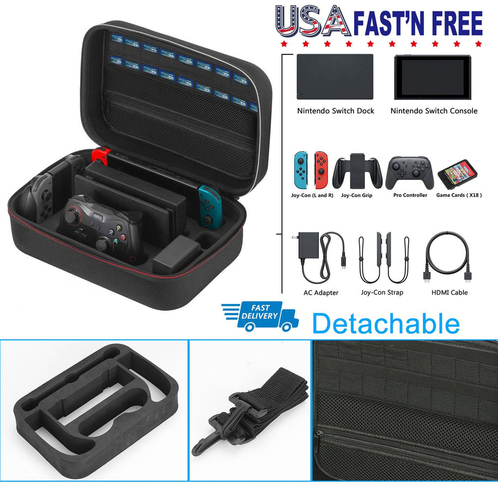 **MULTIPLE STORAGE CASE*:Features with plenty of independent storage compartments to hold the entire Nintendo Switch system,including a Joy-Cons,a Pro Controller,a Nintendo Switch Dock,a Joy-Con Charging Grip,AC Adapter and the Interior mesh pocket for other smaller accessories,like extra Joy-Cons,HD Cable,Joy-Con straps etc. Moreover,its visible 18 game cartridges for game cards or memory cards.