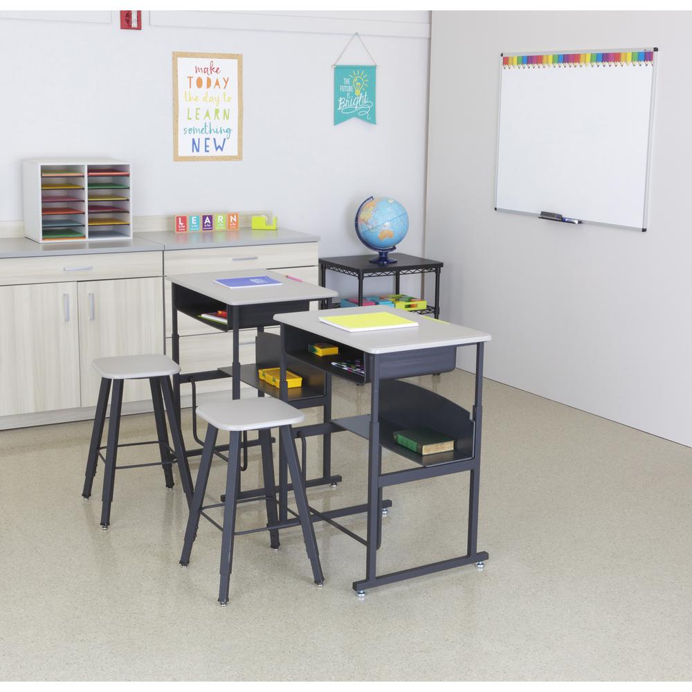 AlphaBetter Adjustable-Height Student Stool gives students the option of swinging their legs for continuous movement, which may facilitate better breathing and lumbar support with slouch-free, ''open-angled'' posturing. Height adjusts in 1-1/4'' increments (21-1/2'' to 35-1/2'') to accommodate students of all ages and sizes and so you can pair it with Safco AlphaBetter Adjustable-Height Stand-Up Desks. Welded steel frame is powder-coated for durability and features a wide-angle, tip-resistant base design for student safety. The 13'' x 13'' seat is made from 5/8'' thick medium-density fiberboard with Thermoplastic laminate finish that is chemical-resistant and impact-resistant. Metal, swivel-glide feet allow easy movement across smooth and carpeted floors