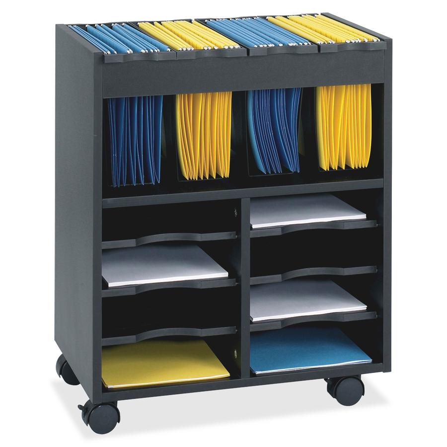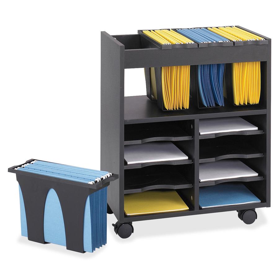 Innovative mobile cart offers adjustable literature trays for the storage of flat materials and tubs for hanging files. Furniture-grade compressed wood has a laminate finish. Design includes four removable plastic tubs, each offering a 5'' width for letter-size hanging files (sold separately). Mobile cart also has six pullout, 9-5/8'' wide x 11-5/8'' deep shelves that form up to eight letter-size compartments. Easily roll cart on four casters (two locking).